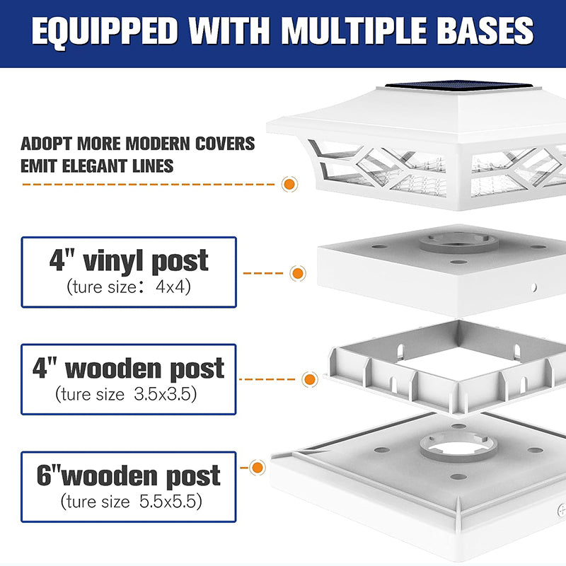 - [Applicable Size ]- APONUO solar post cap lights measures 5.71x5.71x2.76 inches, comes with screw fittings and 3 different sizes of bases. You can mount the 4x4 post solar lights on 4x4,6x6 (actual 3.5x3.5,5.5x5.5) inches wooden post caps,or you can mount aponuo 4x4 solar post cap lights on 4x4 (actual 4x4) inches vinyl/plastic post caps. Note:Does not fit actual size 4x4 wood post caps,5x5 vinyl post caps.
